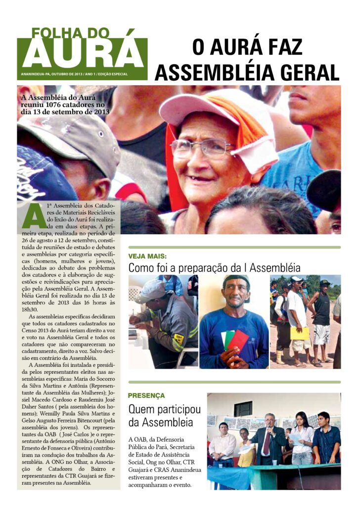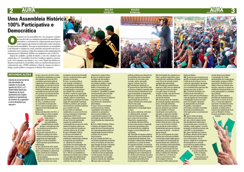 A 1ª Assembleia Geral contou com a participação direta de 1076 catadores e de outros 787 catadores, de forma indireta, quando participaram nas assembleias por categorias e nas discussões realizadas em preparação da Assembleia, durante o processo de cadastramento. A ausência destes na Assembléia foi justificada por questões de saúde ou de problemas pessoais e familiares. Visualizar em PDF.